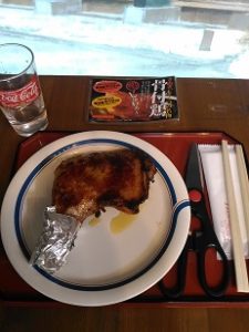 こちらをお店の中で食べていたら、「骨付き鶏あります」の文字が。「ん?骨付き鶏?ケンミンShowでみたなあ」と思い、こちらも追加注文。